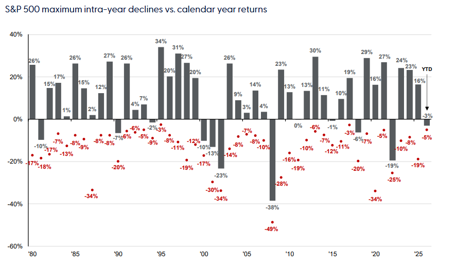 Periods of market stress are almost inevitable. Historically, the average calendar year includes a drawdown of roughly 14% at some point, even in otherwise strong years.
