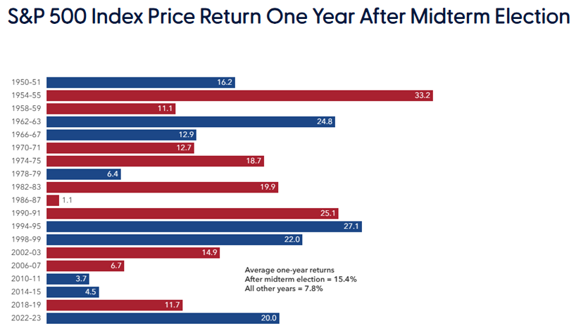 Once the fog of the election season lifts, investors return to fundamental data in evaluating markets. In the third year of a presidential term, administrations often pivot toward pro-growth policies, whether to support reelection efforts, cement their legacy, or strengthen their parties for the next election cycle. This tends to lead to an improving economy, more supportive fiscal and regulatory policies, and a better outlook for corporate earnings. Taken together, these factors have historically made the year following midterms one of the strongest periods for equity market returns.