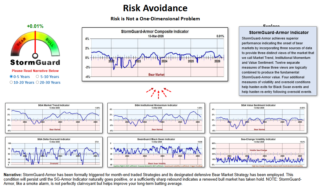 StormGuard-Armor returned to positive territory on 03/13/26 after ending the month negative on 02/27/26, officially triggering month-end trading into defensive Bear Market Strategies for all Canopy Dual Defense Portfolios.