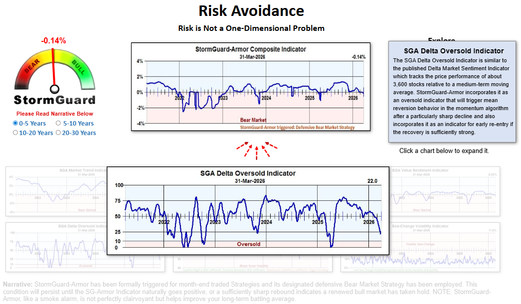 The first quarter of 2026 has already brought us a correction (-10% decline from recent highs) in the Dow and Nasdaq; however, overall market fundamentals are strong, as indicated by the sub-components of StormGuard (Market Trend Indicator, Institutional Momentum Indicator, Delta Oversold Indicator), suggesting that resolution of things like the Iran conflict and government shutdown will be a significant tailwind to an otherwise healthy market and economy.
