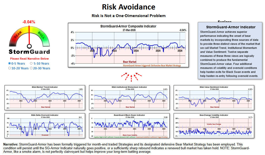 So What: Our “Bear Market” posture will be cautiously optimistic - rather than retreat to traditional safe-havens that have also continued to decline during the first quarter of 2026, we will enhance our cash positions to 50% and remain invested in normal growth strategies to allow for upside participation that still naturally occurs even during bear markets and recessions. Once there are clear signals of resolution and a return to a positive and rising StormGuard, we will deploy cash reserves and “buy the dip,” capitalizing on the lower prices.
