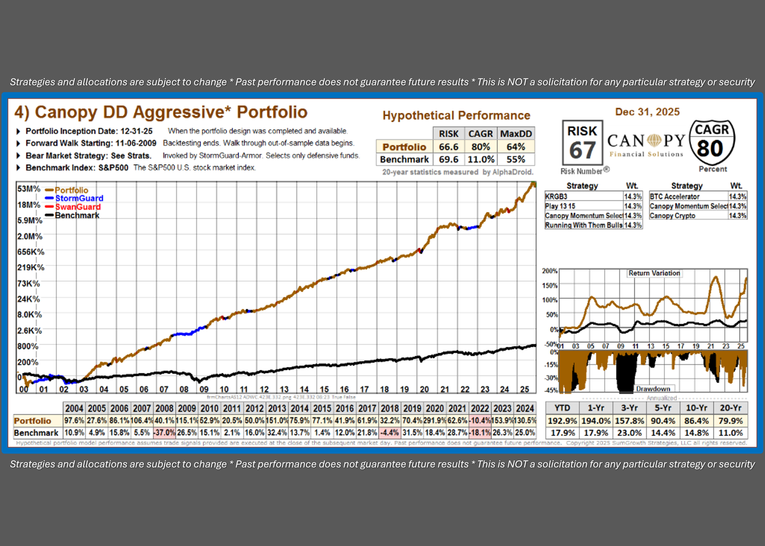 Similar to the Canopy Standard Growth Fund, this portfolio implements a Dual Defense approach to identify the highest growth opportunities and trends using single stocks, 2-3x leveraged ETFs, thematic leaders and cryptocurrency funds. The Canop AGGRESSIVE Fund has Alpha-Crushing potential.
